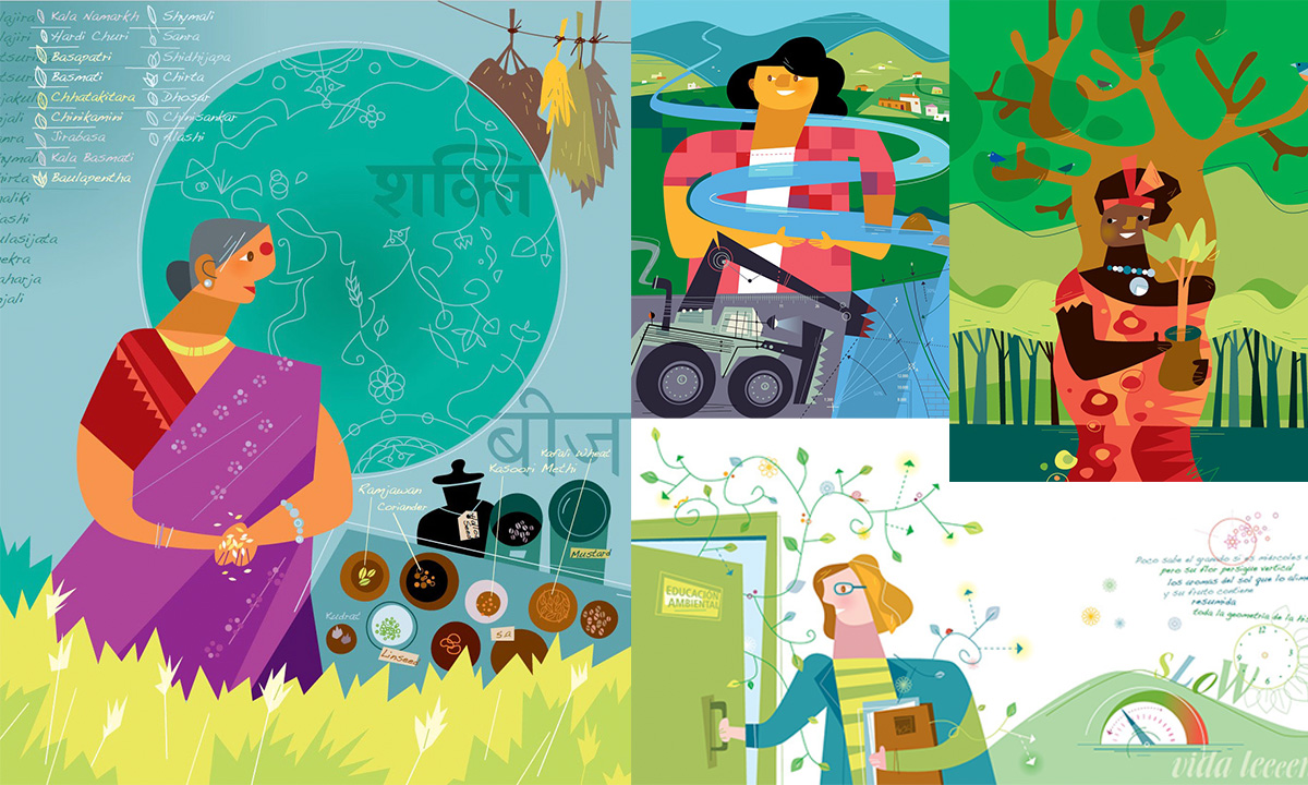 Junto a ellas aparecen mujeres que defendieron el territorio y los derechos de sus comunidades, como Wangari Maathai, fundadora del movimiento Cinturón Verde en Kenia, o Berta Cáceres, líder indígena que luchó por proteger los ríos y la cultura del pueblo lenca. También destacan Vandana Shiva, referente internacional en la defensa de la agricultura ecológica y la biodiversidad agraria, y Lois Gibbs, símbolo del activismo ciudadano que surge desde las comunidades locales para proteger la salud y el entorno.